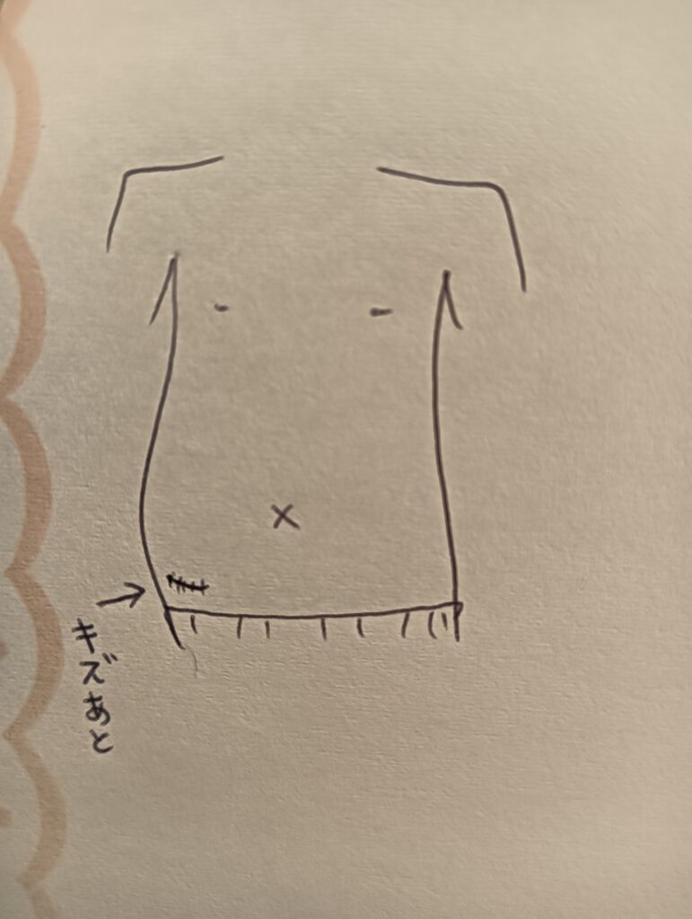 皮膚移植については旦那は腹毛が生えてるので、「毛が生えてる部分の皮膚を使ってもらったら多少ハゲ緩和になるかもよww」なんて先生とも笑いながら話していましたが、実際にはお腹の皮膚の具合を見て先生が判断して移植に良さそうなところからとったので、そんなに毛は生えてるところじゃありませんでした。場所はこんな感じです。↓↓