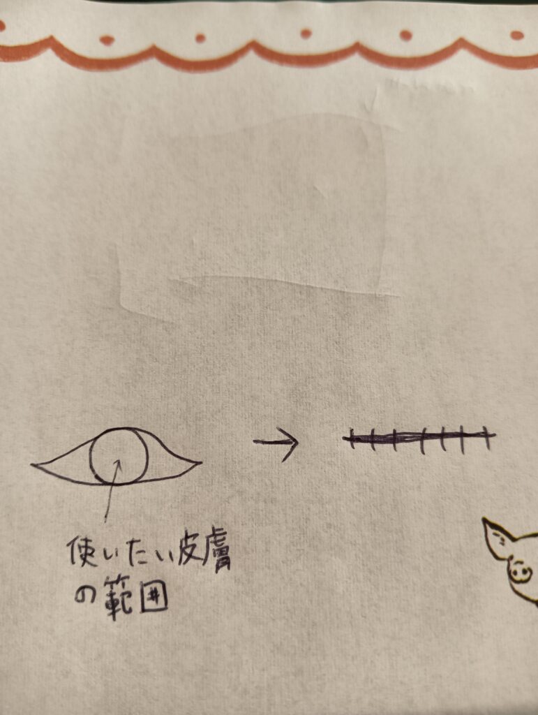 そしてお腹の皮膚は必要な形は丸ですが、丸く切ってしまうと閉じるときに皮膚がヨレてしまうので、切り取る範囲は↓↓こんな感じに横長に切り取ります。