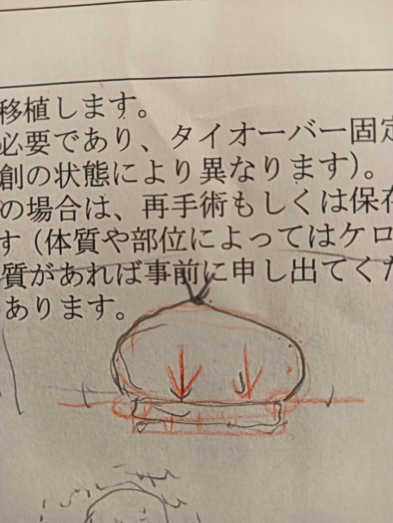 皮膚移植後はガーゼを小さな団子みたいにして少し圧迫することが大事だそうです。下の写真は実際に先生が説明のときに書いてくださったものです。