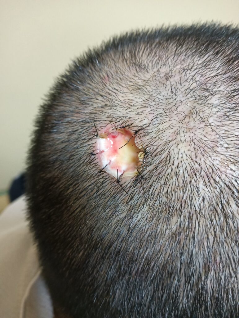 傷が縮んだようで、上に貼ってある透明フィルムが頭皮より少し飛び出でいるのが見えると思います。旦那は最初の手術の時切り取ったがんの部分を見せてもらったみたいですが、少し灰色っぽい色をしていて小さくて1センチもないぐらいだったそうですが、悪性となるとこんなに大きく切り取らないといけないんだね~って二人で話していました。仕事はちょっとうろ覚えで申し訳ないんですが、術後一週間は休んだ気がします。